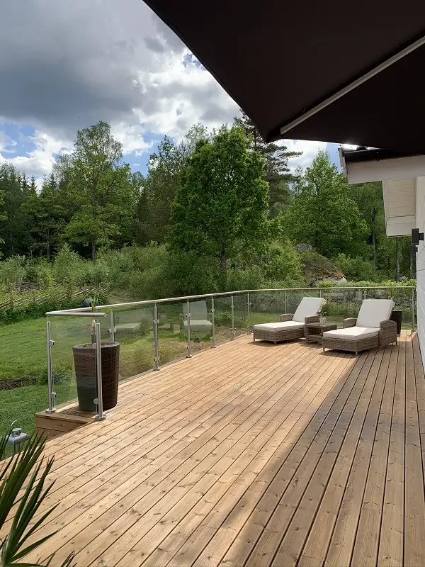 Glasräcken ger ett elegant och stilrent utseende och maximerar utsikten från din altan. De är särskilt populära för altaner med vacker utsikt eller för dem som vill skapa en öppen och luftig känsla. Glasräcken kan kombineras med både trä- och metallstolpar för att skapa en unik design. Det är dock viktigt att använda härdat eller laminerat glas för säkerhet och hållbarhet.